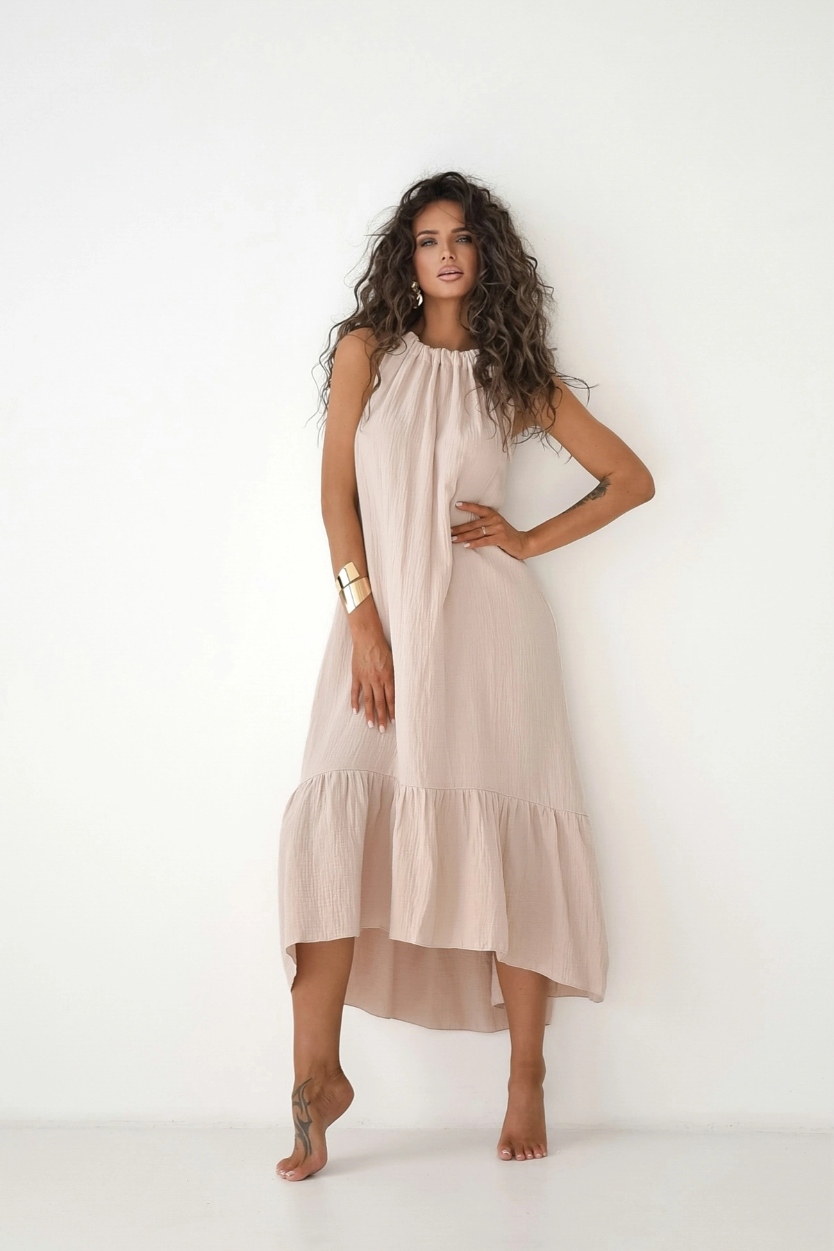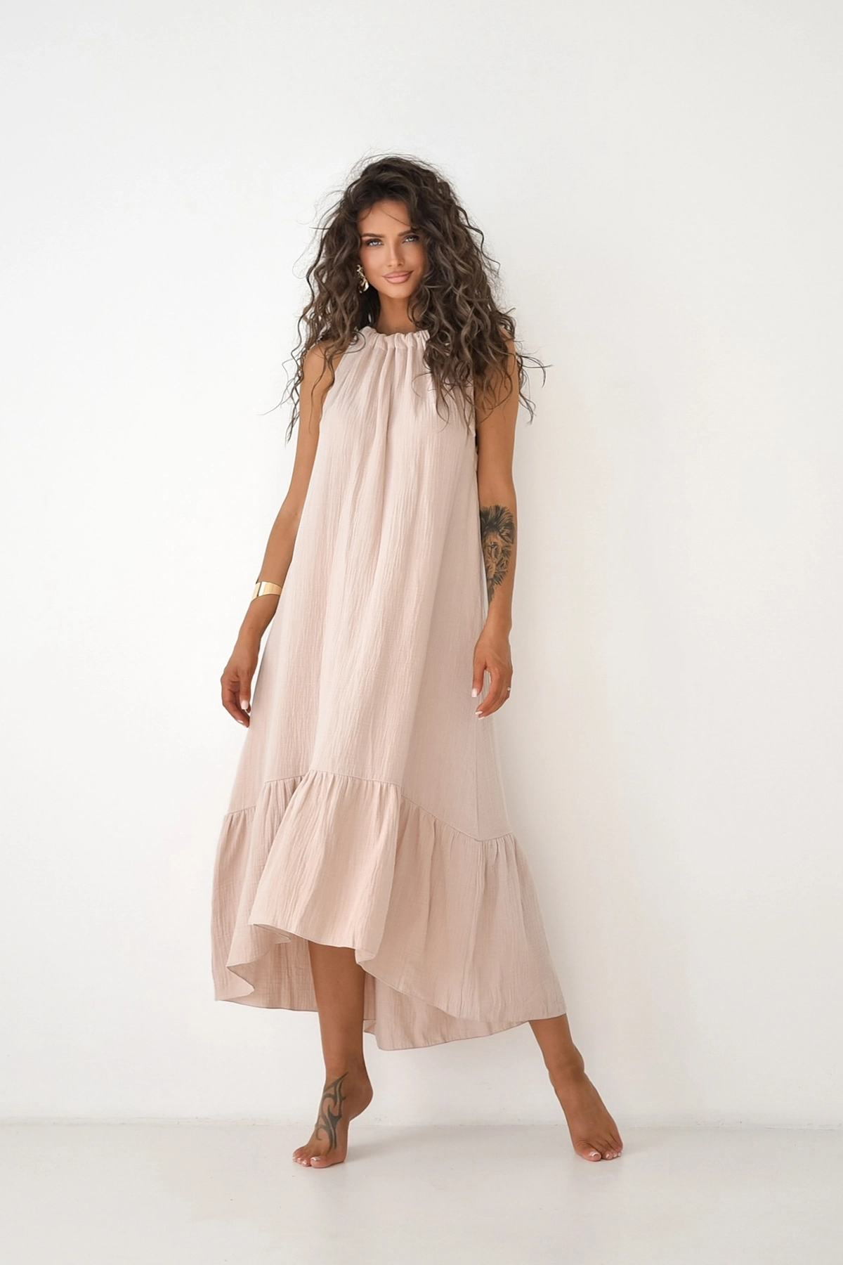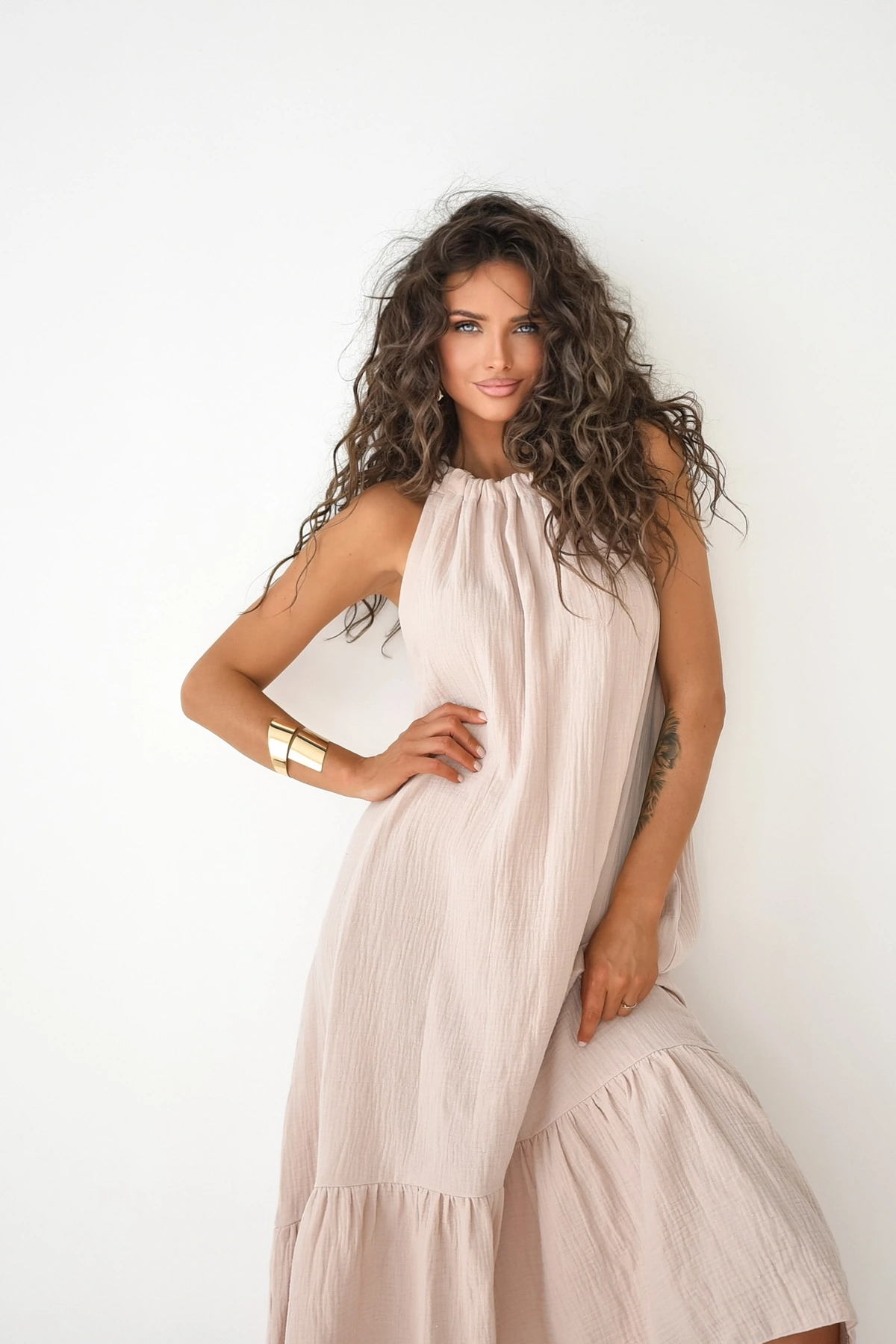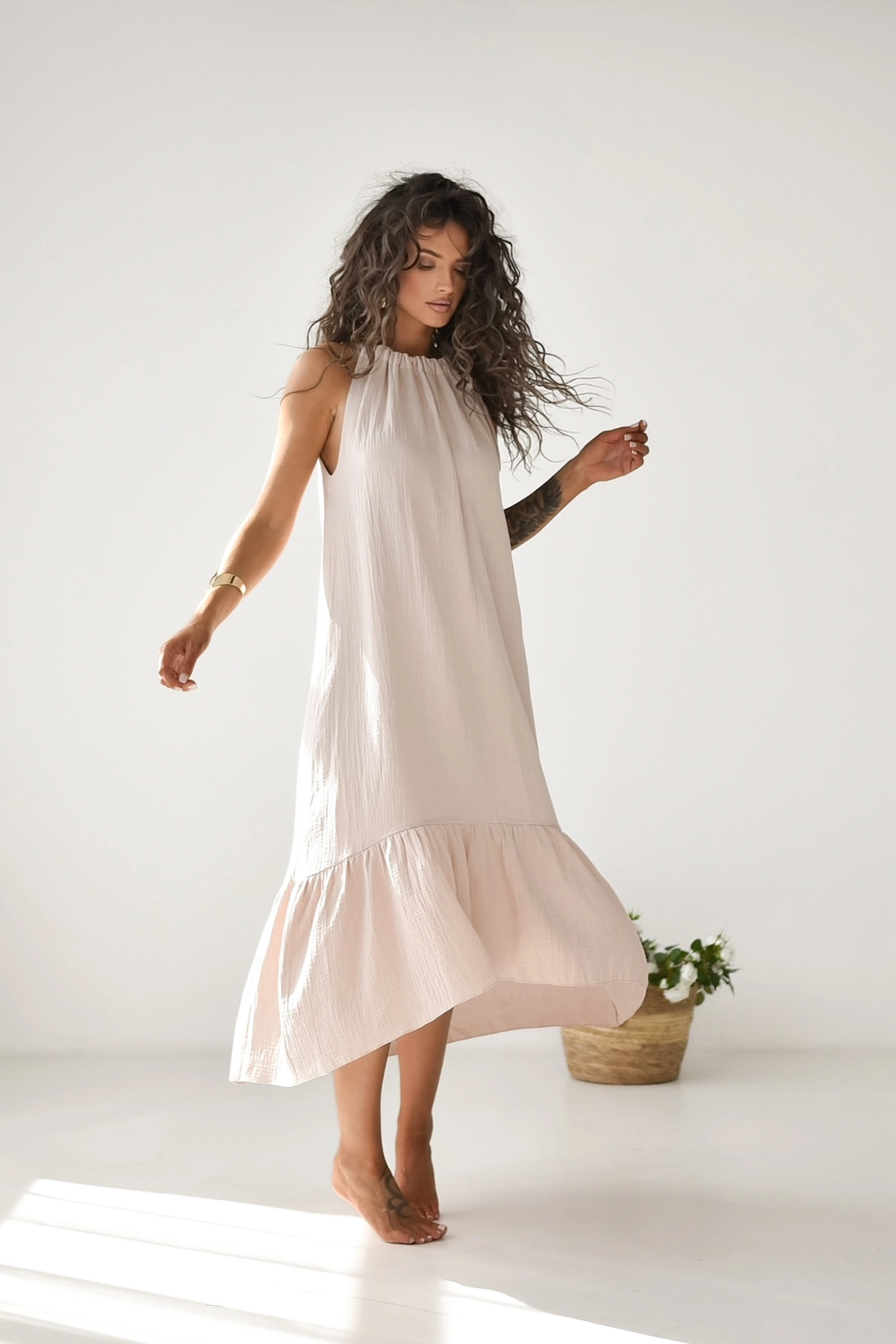 Oto sukienka, która definiuje pojęcie letniej elegancji w nowoczesnym wydaniu. Ten model o długości midi, z intrygującym wiązaniem na szyi (halter-neck), subtelnie odsłania ramiona i plecy, tworząc zmysłowy i eteryczny look. Luźny fason z delikatnie przymarszczoną górą pozwala ciału oddychać, a szeroka, falbaniasta końcówka sprawia, że kreacja pięknie porusza się przy każdym kroku.