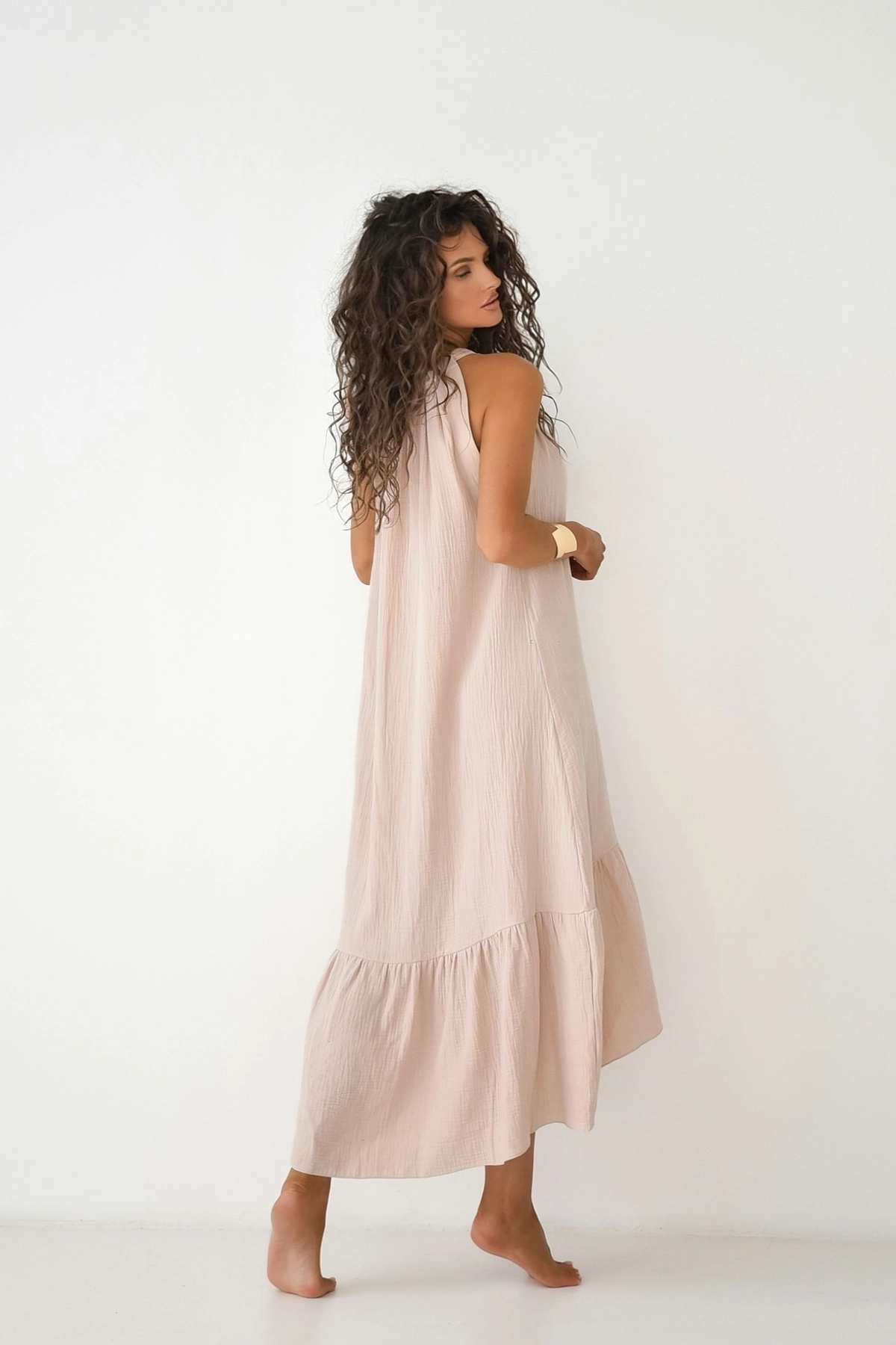 Podsumowanie: Muślinowa sukienka maxi z wiązaniem na szyi i falbaną to połączenie chłodnej elegancji i naturalnego, certyfikowanego komfortu, oferujące zmysłowy look w ekologicznym, polskim wydaniu.