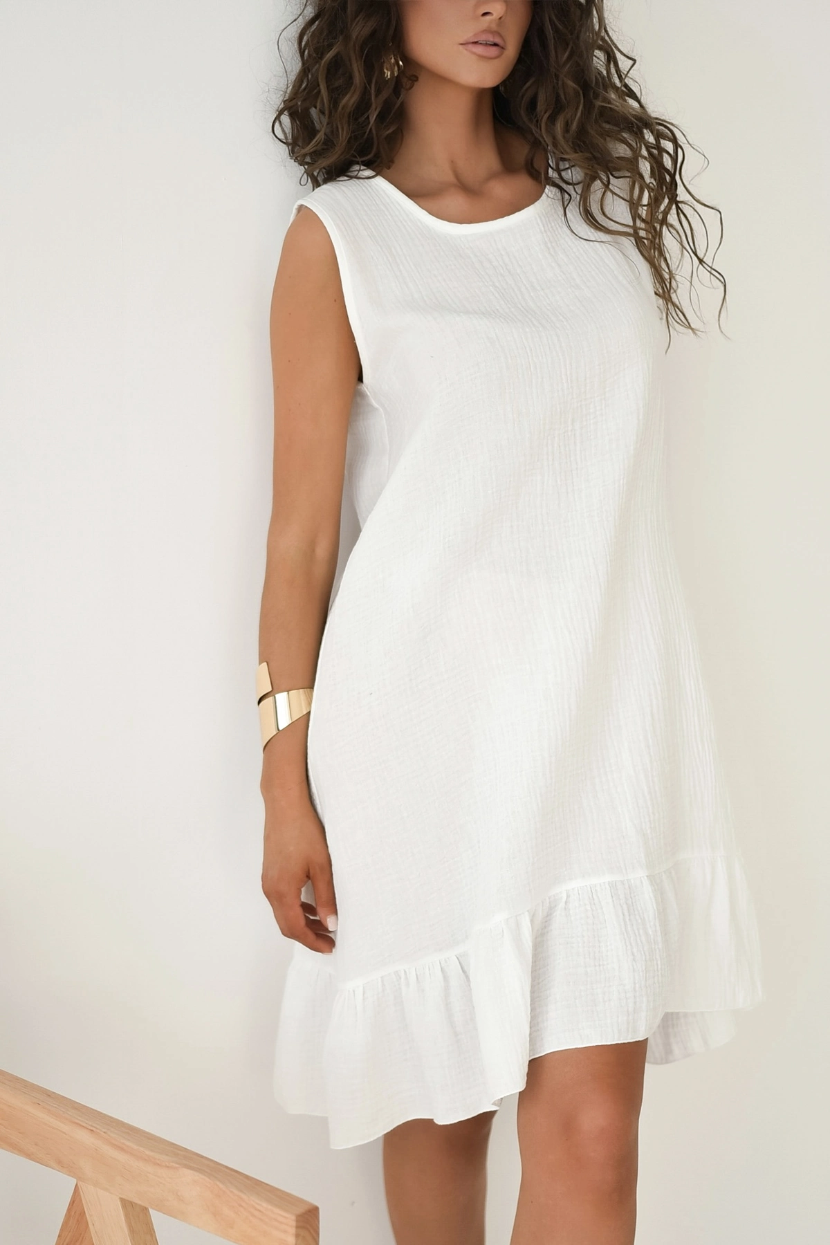 Podsumowanie: Bawełniana sukienka mini bez rękawów z falbaną to połączenie uroczego, swobodnego fasonu i naturalnego, certyfikowanego muślinu, oferujące nieskrępowany komfort w ekologicznym, polskim wydaniu.