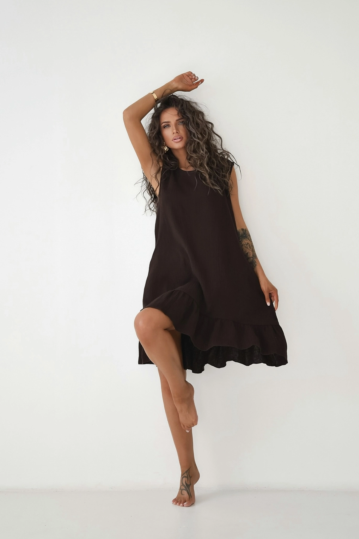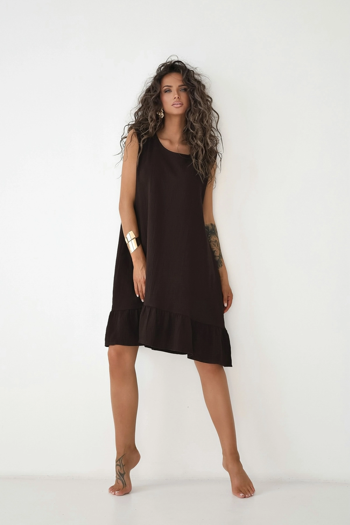 Podsumowanie: Bawełniana sukienka mini bez rękawów z falbaną to połączenie uroczego, swobodnego fasonu i naturalnego, certyfikowanego muślinu, oferujące nieskrępowany komfort w ekologicznym, polskim wydaniu.