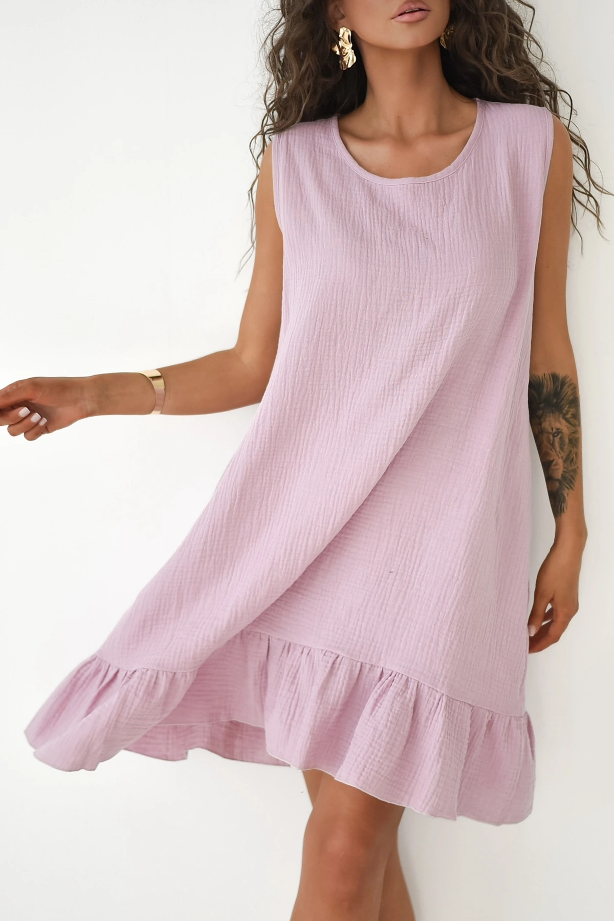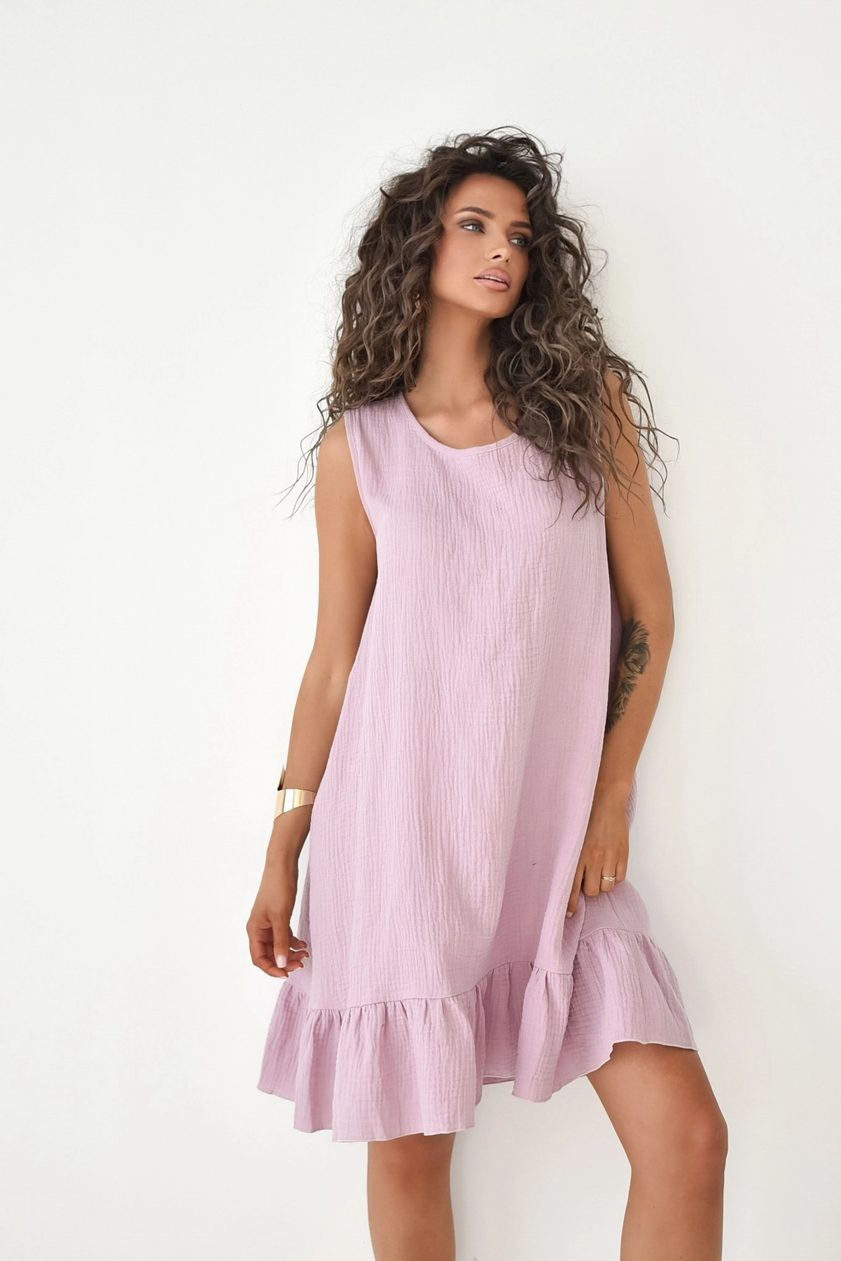 Podsumowanie: Bawełniana sukienka mini bez rękawów z falbaną to połączenie uroczego, swobodnego fasonu i naturalnego, certyfikowanego muślinu, oferujące nieskrępowany komfort w ekologicznym, polskim wydaniu.